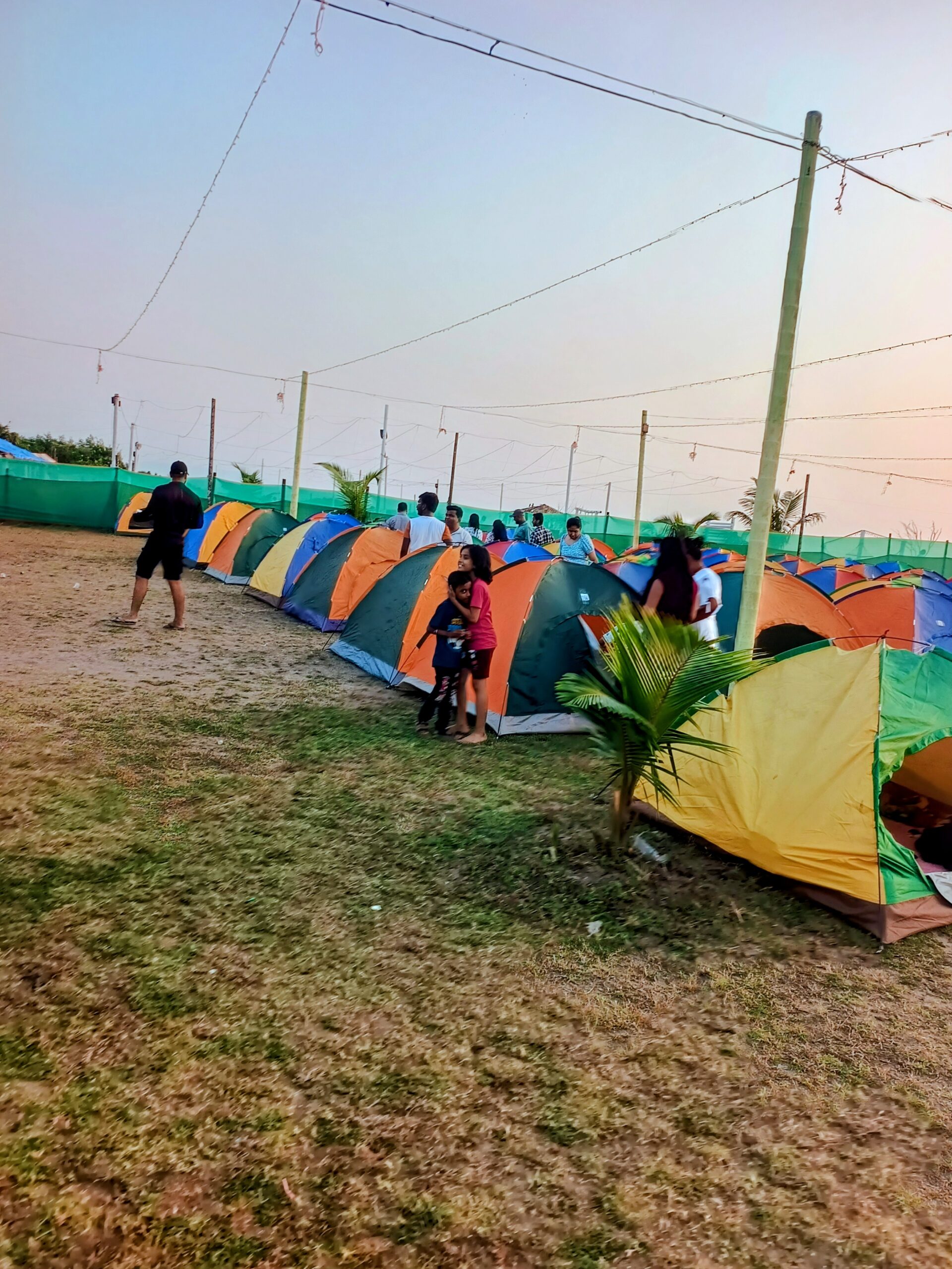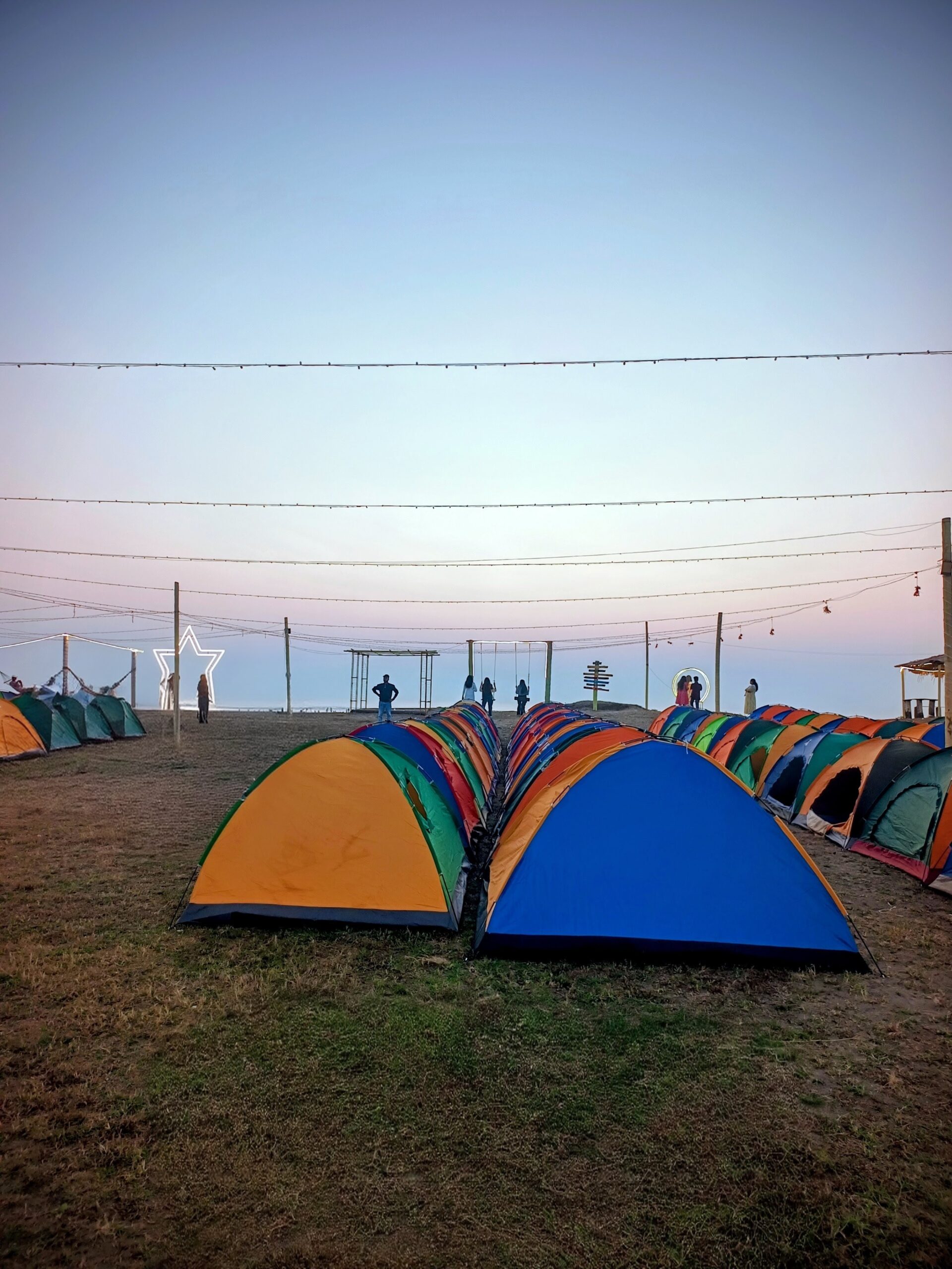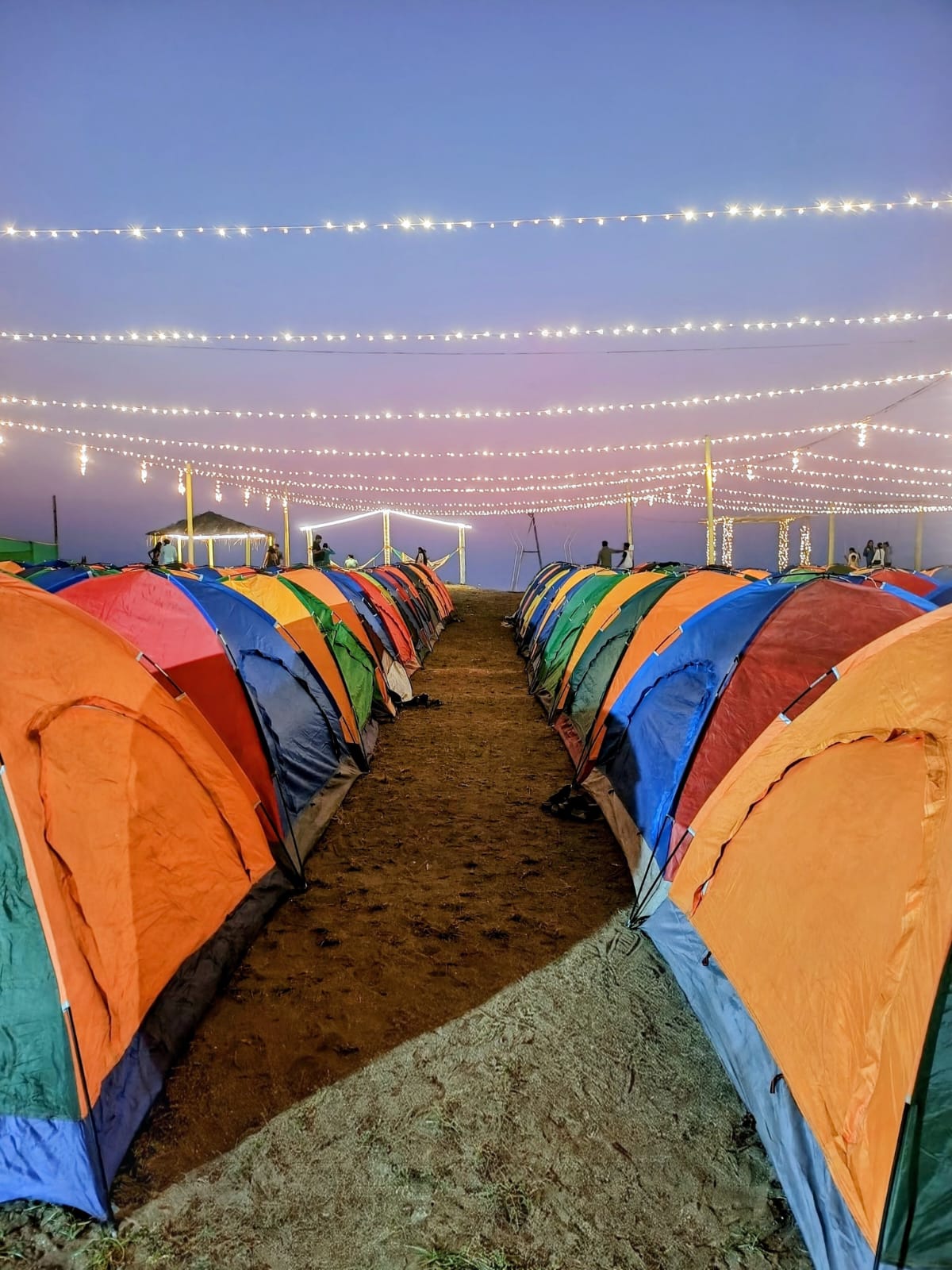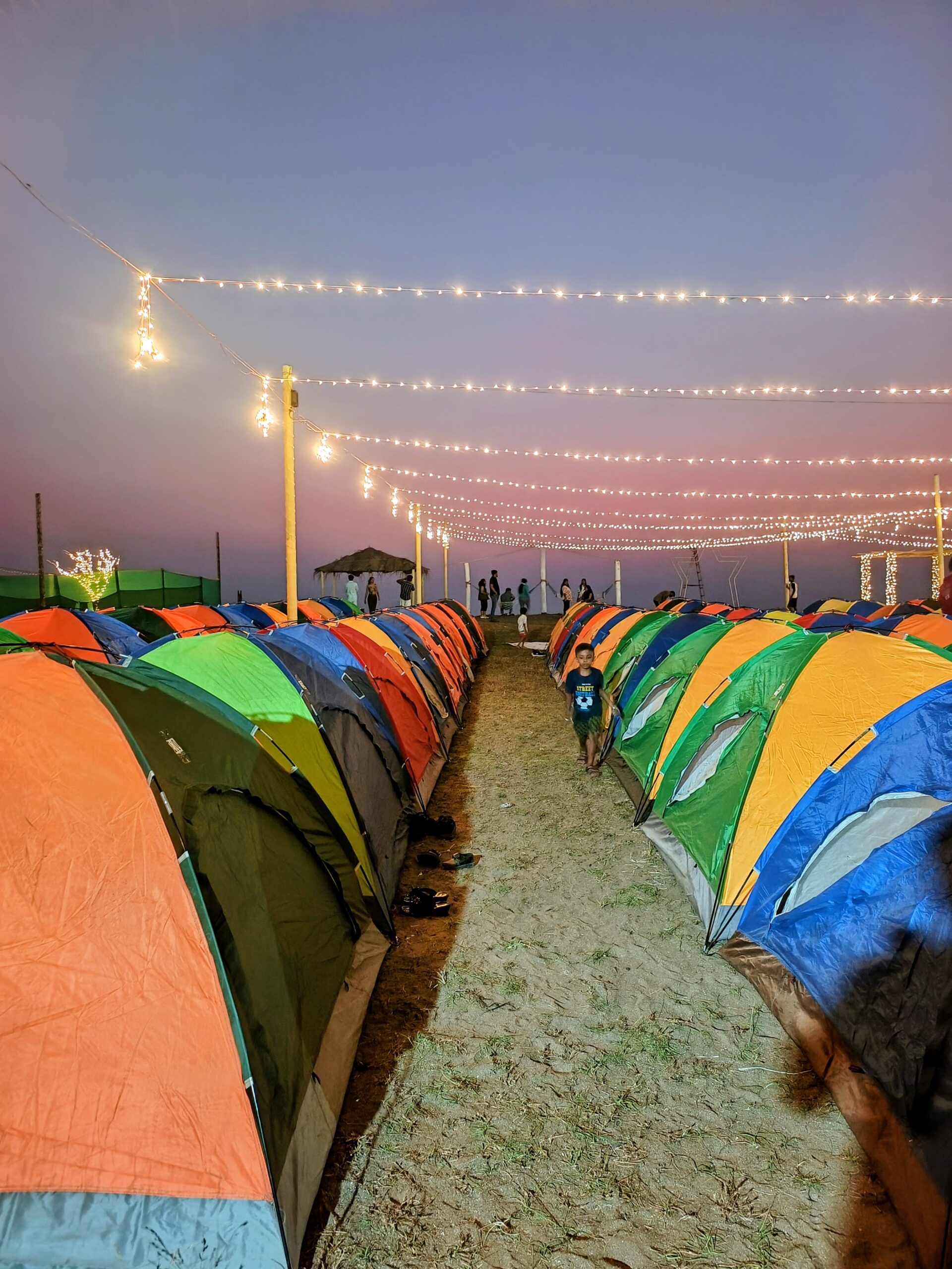 The tents are pitched on the beach itself. Tents will have mattresses, pillows and blankets. Washrooms available